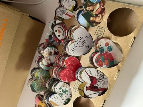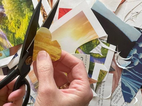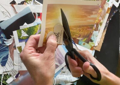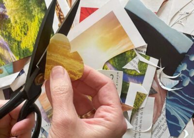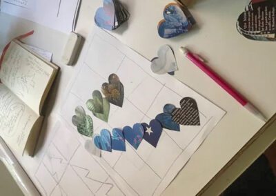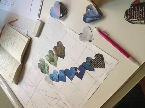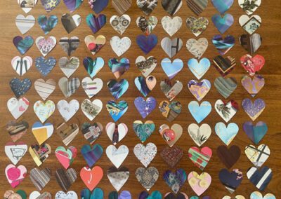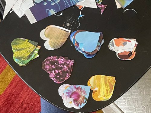 The collage takes shape slowly, layer by layer. What was once an old magazine, becomes a story, a record of how people endured isolation, found connection, and held onto hope. Every placement is intentional, every space between hearts a pause to remember.